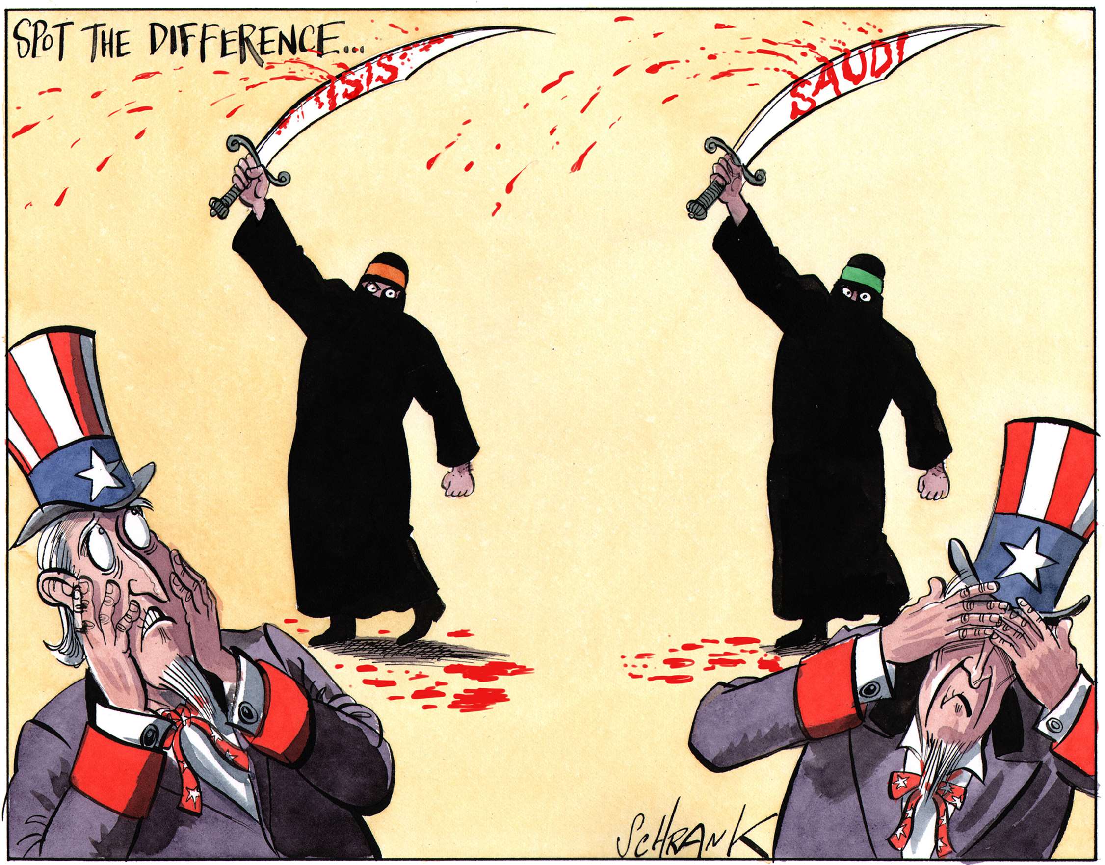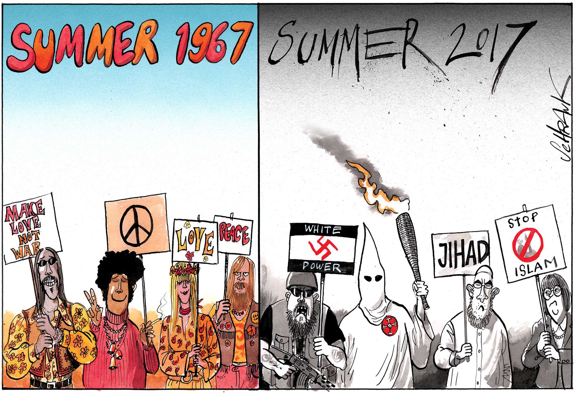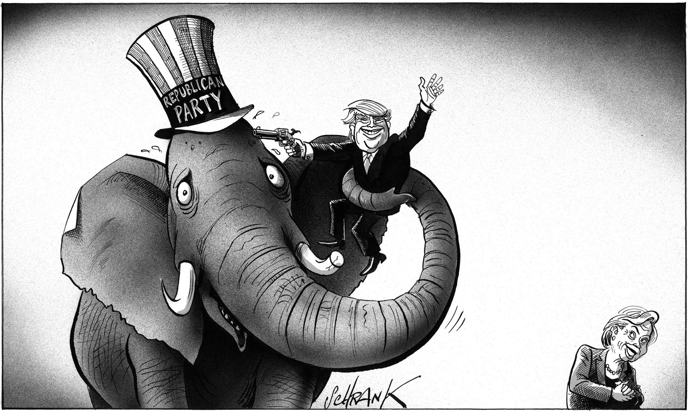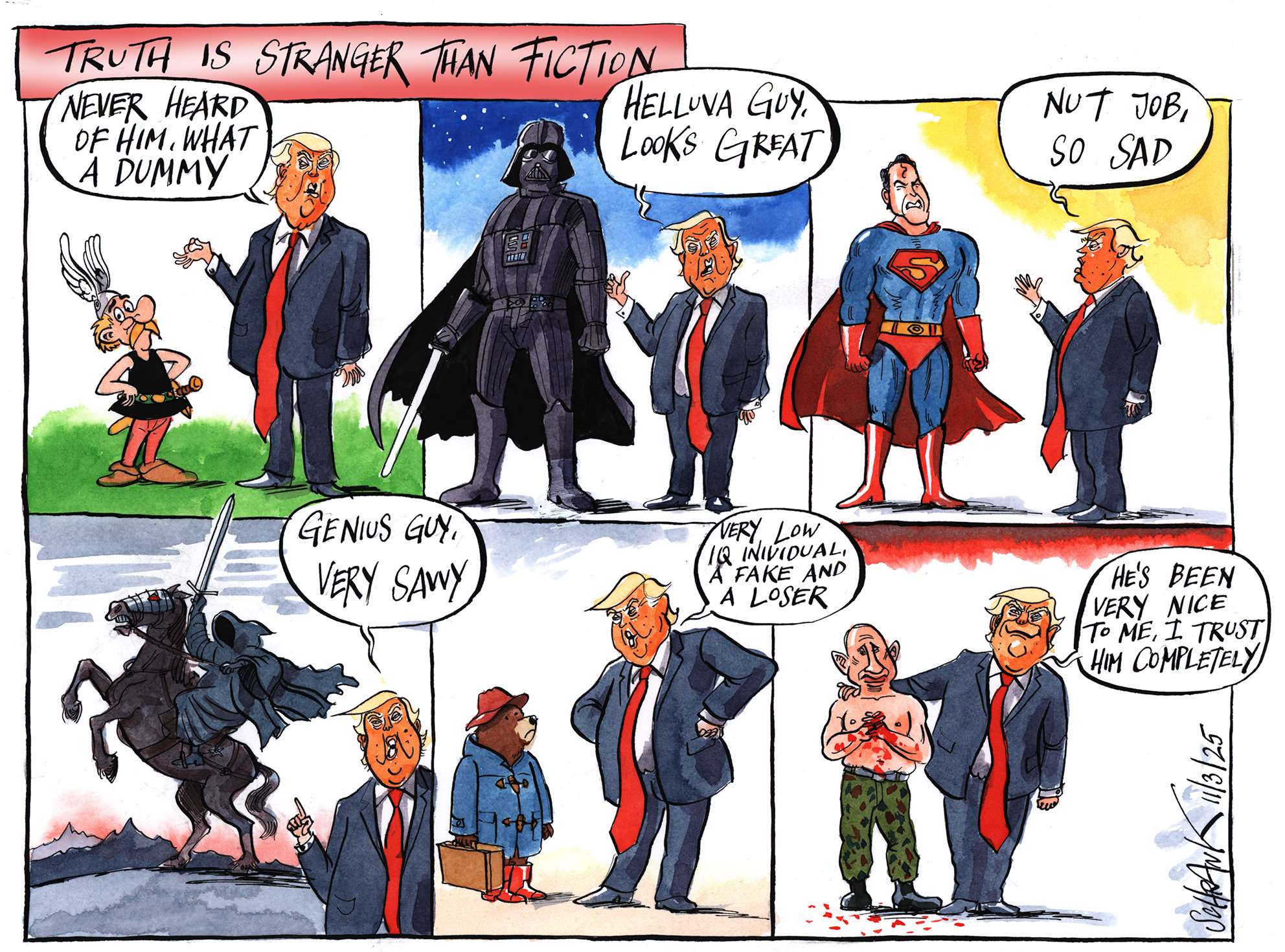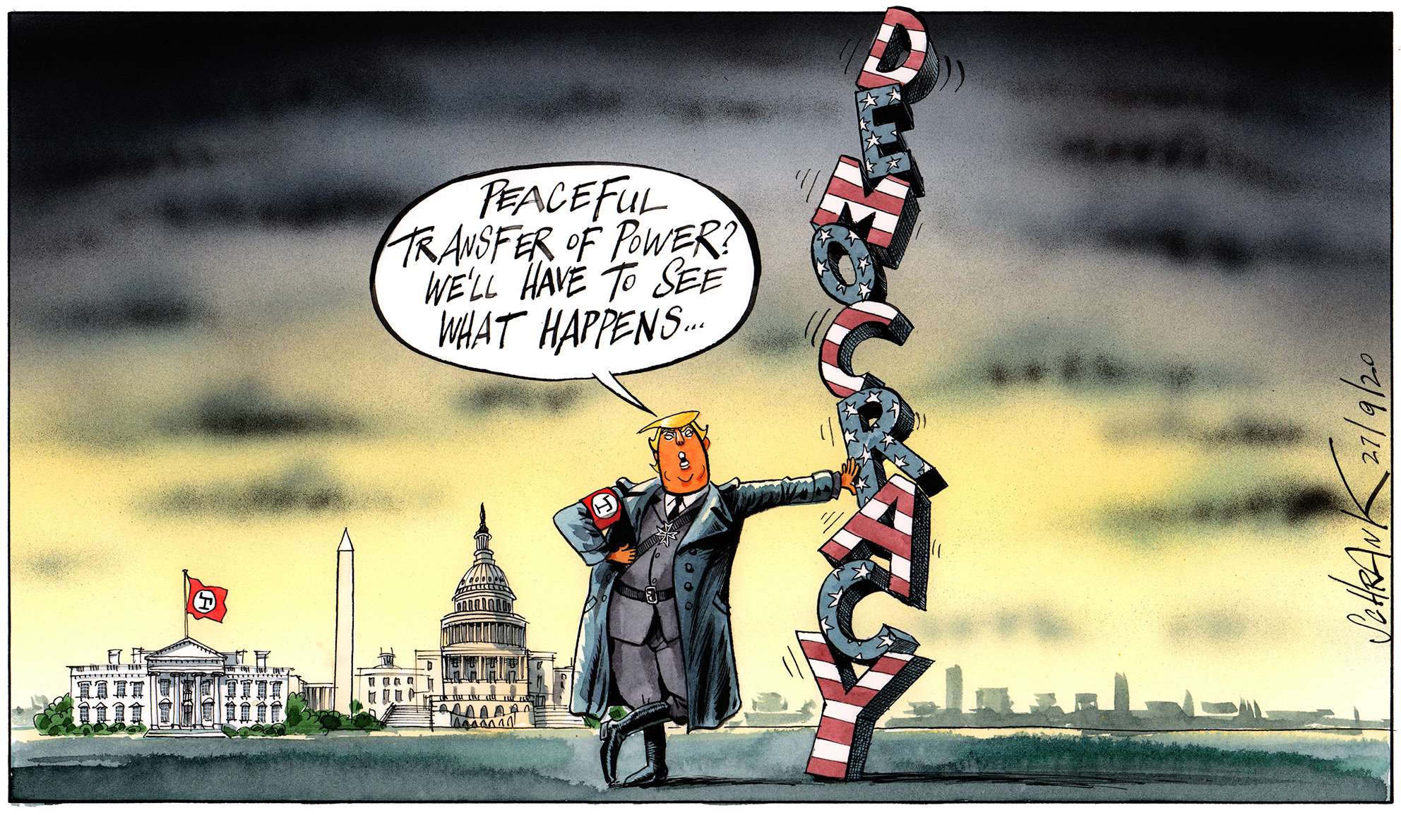 One of the problems with world affairs, particularly in the west, is an all-encompassing cynicism, the kind of thinking that, for example, claims that Trump and Clinton are as bad as each other. Lazy thinking, almost comforting. Why bother, everything is going to hell anyway. This is a dangerous fallacy, which cartoonists, satirists and all professional cynics must not help to perpetuate. Particularly in a world where even the truth and facts are contested. However much we exaggerate, blow things out of proportion, strain for a laugh, we must still stick up for the truth.